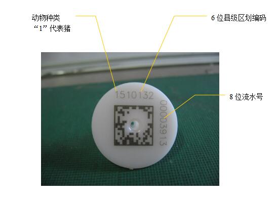 二維碼動物標(biāo)識由二維碼和編碼兩個部分組成。二維碼采用加密技術(shù)的行業(yè)專用碼,具有防偽功能;編碼由動物種類+區(qū)劃編碼+標(biāo)識順序號組成。如下圖所示(以豬耳標(biāo)為例):